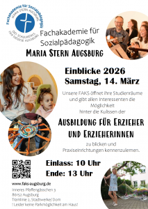 Neugierig geworden? Weitere Informationen dazu finden Sie unter: Ausbildung und Studium an der FAKS Maria Stern Augsburg