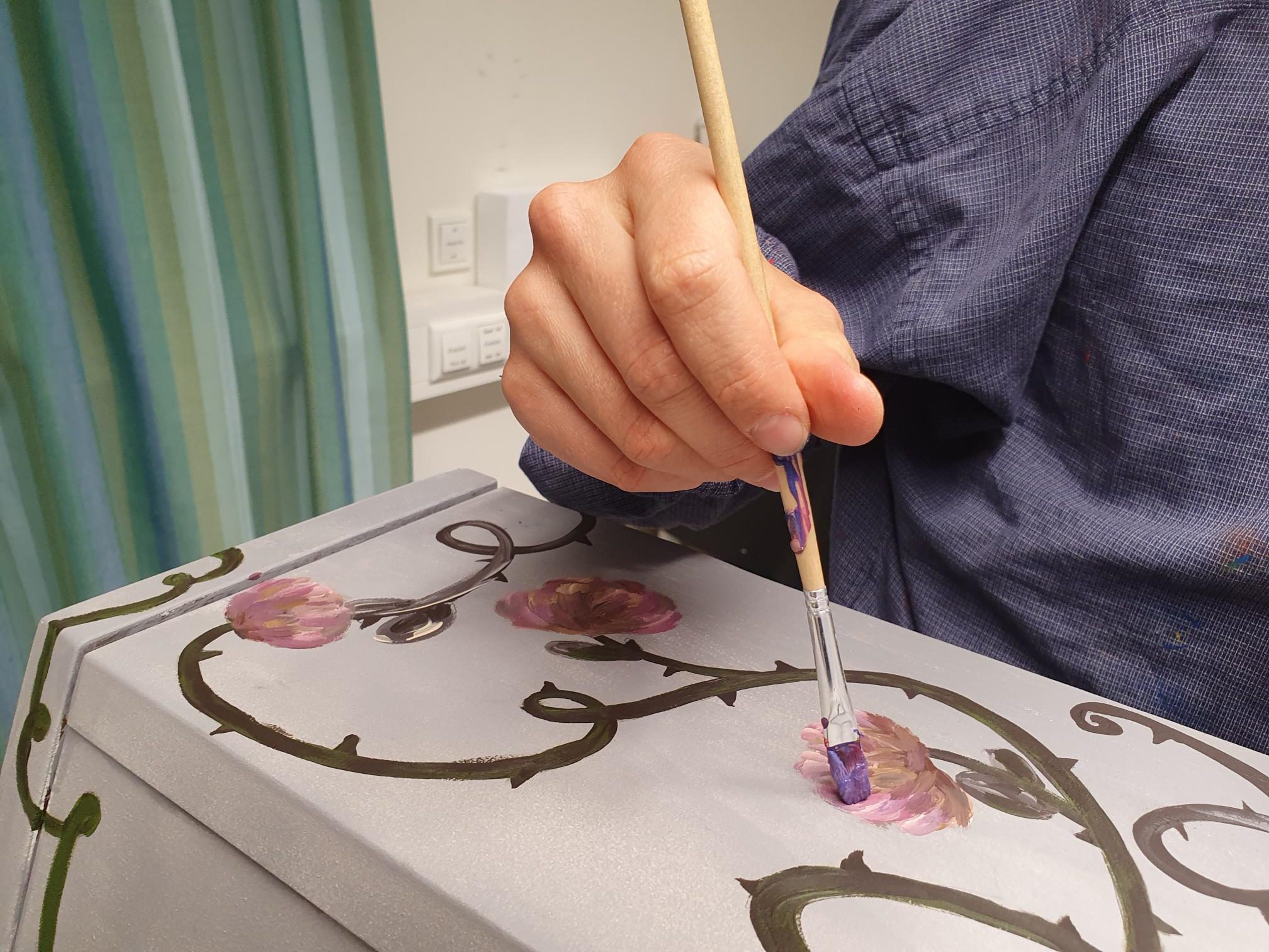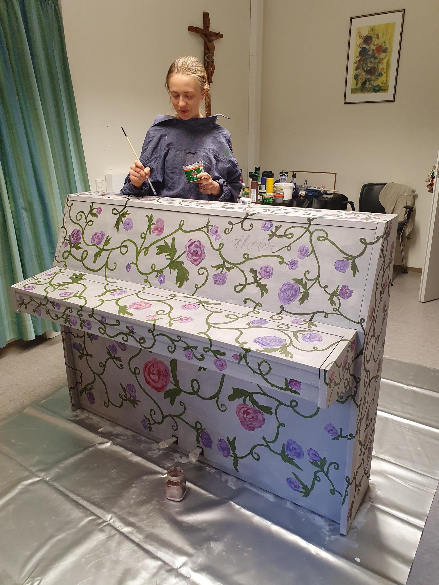 Die Gestaltung erzählt in floralen Ornamenten und leuchtenden Farben von innerem Wandel – vom Ausgelaugtsein hin zur Kraft, die im eigenen Wachstum liegt. In dieser künstlerischen Komposition verschmelzen Emotion und Ausdruck zu einem Bild der Resilienz: Eine Seite des Klaviers zeigt einen Zustand des Rückzugs und der Erschöpfung – doch der Blick wendet sich nach vorn. Die floralen Muster nehmen zu, das Leben kehrt zurück, verstärkt durch die symbolische Kraft des verwendeten Blattgoldes. Musik wird zur Quelle der Hoffnung, sie spendet Energie, verbindet Menschen – und eröffnet neue Perspektiven.