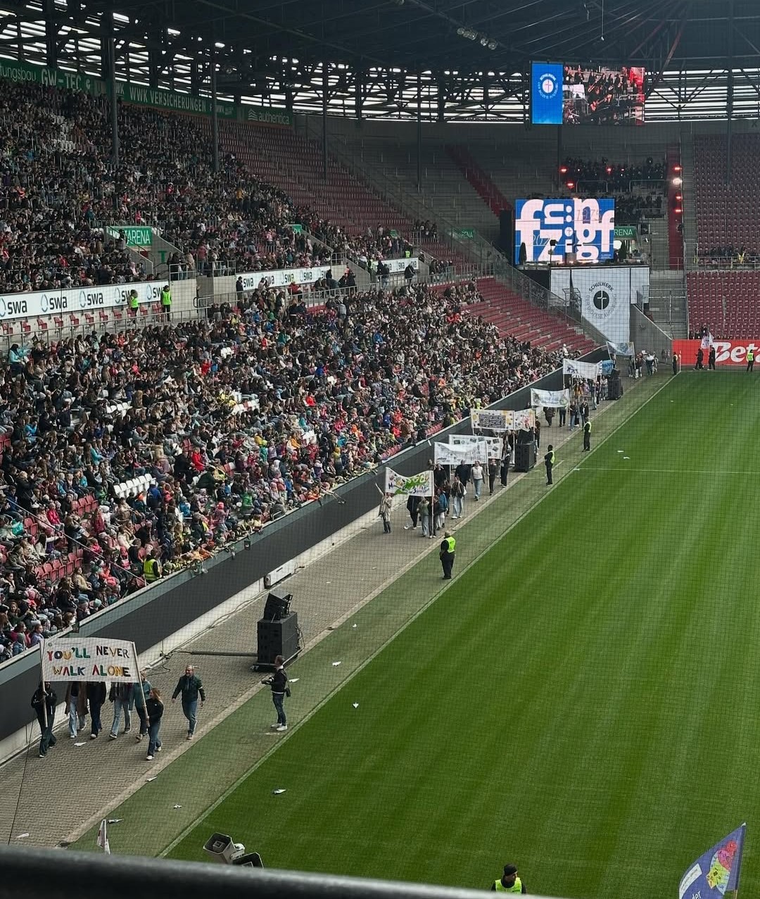 Selbst gestaltete Banner im Wind, Stimmengewirr, erwartungsvolle Gesichter: In der vollbesetzten WWK Arena in Augsburg lag spürbar Vorfreude in der Luft. Wo sonst der FCA spielt, feierte am 10. Oktober die große Schulfamilie des Schulwerks der Diözese Augsburg ihren 50. Geburtstag – mit mehr als 20.000 Schülerinnen und Schülern sowie 2.300 Mitarbeitenden aus 46 Schulen.