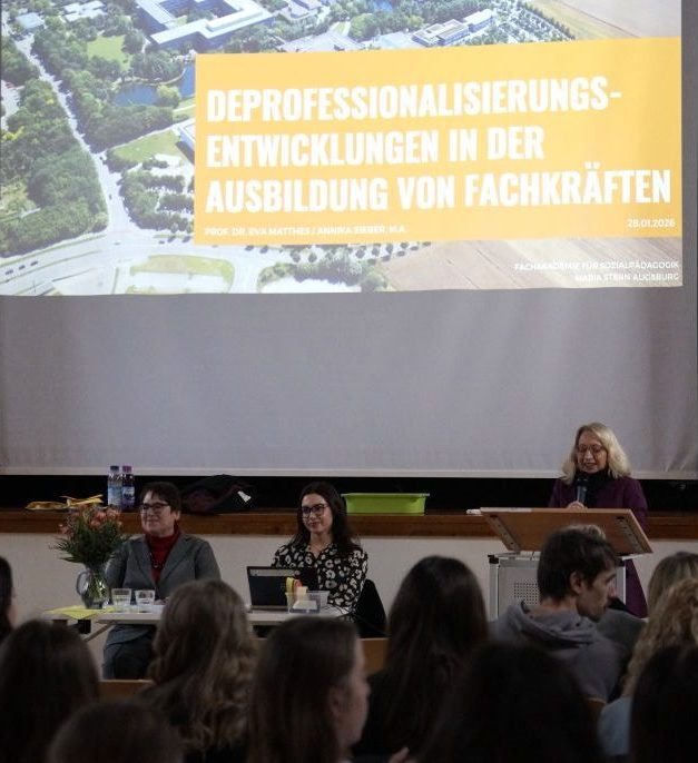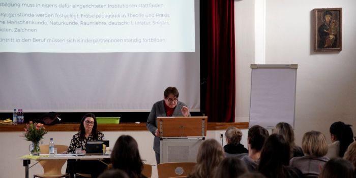 Frau Prof:in Matthes richtete zunächst den Blick in die Geschichte. Friedrich Fröbel war es, der bereits 1885 eine professionelle Ausbildung für die „Kindergärtnerinnen und Hortnerinnen“ forderte und Leitlinien dazu formulierte.